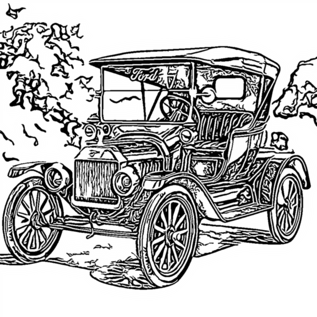 Classic automobiles with mechanical precision—every spoke, panel, and detail captured in clean outlines